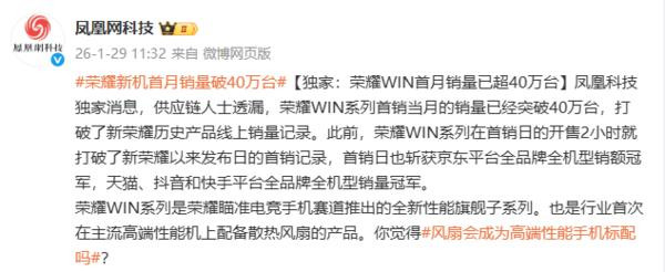 【CNMO科技消息】1月29日,据媒体报道,荣耀旗下全新性能旗舰子系列——WIN系列首月销量突破40万台。这一成绩刷新了荣耀独立以来所有产品线的单月销量纪录。
