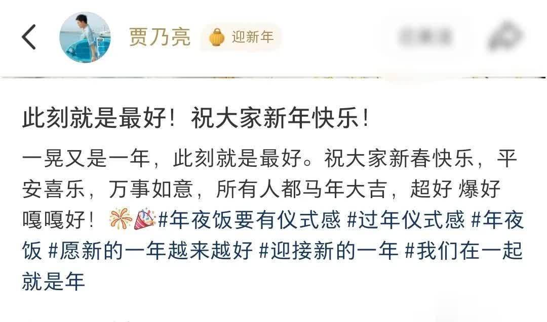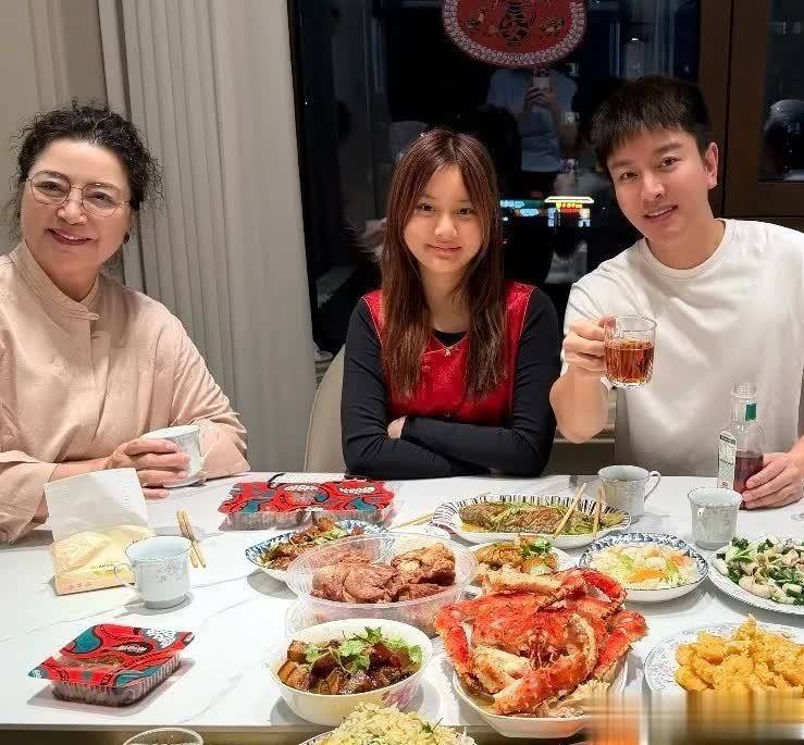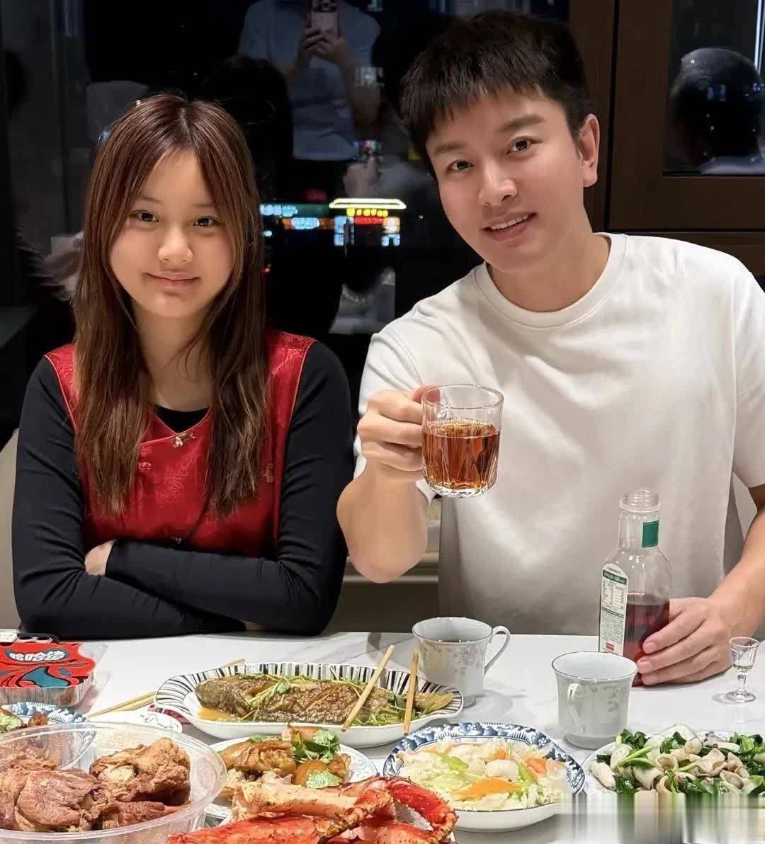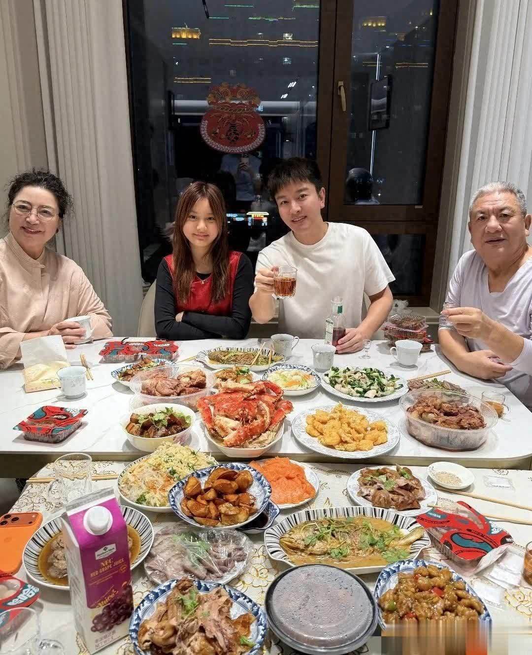 餐桌上菜品丰富,帝王蟹,炸肉段,还有鸡腿,牛肉等等。贾乃亮还有他的父母举杯对着镜头,甜馨则是双手环抱,动作自然。贾乃亮还配文祝福大家新年快乐,万事如意,马年大吉。